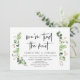 Tarjeta de invitación de fuga de novios con tema de jardín de verano con hojas verdes, guión negro moderno (Nos hemos casado). Es perfecta para su recepción de fuga de novios / fiesta de celebración después de la boda. Agregue sus detalles en fuente / letra negra coincidente.