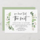 Tarjeta de invitación de boda fugada con tema de jardín de verano con hojas verdes, guión negro moderno (Nos hemos casado). Es perfecta para su recepción de boda fugada / fiesta de celebración post boda. Agregue sus detalles en fuente / letra negra coincidente.