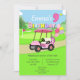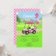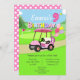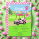 ¡Celebra el noveno cumpleaños de una niña especial con esta encantadora invitación temática al golf! Con un adorable carrito de golf de punto de polka rosa estacionado al lado de un putting green, este dulce diseño está lleno de detalles juguetones, un pastel de cumpleaños festivo y un montón de globos de helio brillantes, incluido un gran globo número 1. Perfecto para una familia amante del golf o para un tema único de noveno cumpleaños, esta invitación marca la pauta para un día divertido dentro y fuera del verde.