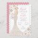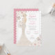 La glamorosa invitación a la ducha de novia incluye a una novia con un vestido de boda de encaje brillante y adornado con flores de acuarela de color rosa y blanco. Hay varias opciones disponibles para el pelo y el tono de piel de la novia.