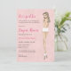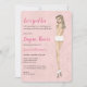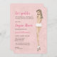 Dé a la futura novia una ducha de lencería sexy con estas modas invitaciones a presentar a la novia en nada más que sus tacones y bragas! Fondo de material de lencería rosada y dorada con sujetador y vestido con el tamaño de la novia en la parte posterior. Múltiples opciones disponibles para el personalizar del estilo de cabello de las novias, color de cabello y tono de piel.