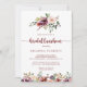 Esta rústica invitación floral a la ducha nupcial lunar con novia es perfecta para una simple ducha de boda. El diseño se compone de flores de color burdeos, rosa y azul con hojas verdes en un fondo manchado de color marrón.