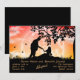 Silueta romántica de una pareja bajo un árbol con una luna llena en el fondo y algunas mariposas. El fondo es un cielo rojo y naranja estrellado y nublado. Ideal para un anuncio de fuga o fiesta de compromiso.