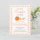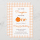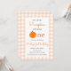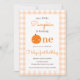 Nuestro pequeño calabaza primer Naranja primer cumpleaños Este lindo diseño presenta un tema de calabaza con fondo de textura de tela Gingham naranja. Personalice la invitación con sus detalles y si desea reorganizar el estilo y la ubicación del texto, pulse el botón "Haga clic para más personalizares". Para más productos en el mismo tema visita mi tienda: Youtopia Official.