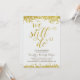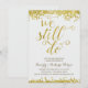 Una invitación de fiesta de aniversario de bodas de oro número 50 que presenta la romántica frase "Nuestros aún" escrita en hermosa caligrafía con un aspecto de hoja de oro falso, confeti de oro falso en la parte superior e inferior de la tarjeta, y un fondo gris claro chic.