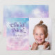 Una carta de invitación para una fiesta de cumpleaños con un ilustracion acuarela de color rosa, azul y rosa con estrellas y nubes. El texto dice "Estamos en la Nueve Nube". Perfecto para tu noveno cumpleaños de tu chica. Añada la foto de su hijo a esta invitación.