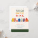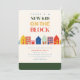 Invitación a la ducha neutra para bebés con ilustracion de una fila de casas con paleta rosa, azul, rojo, verde, naranja y amarillo.