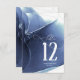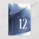 Un fondo abstracto que recuerda a la tinta líquida en tonos de azul marino profundo a cian y blanco es el telón de fondo para un texto de escritura manuscrita elegante y diseños modernos en las piezas de esta hermosa suite boda. La tarjeta de número de tabla del boda que se muestra aquí incluye lo anterior y una plantilla para agregar su propia información de evento pertinente. Buscar ID762 para ver todas las piezas de coordinación de este conjunto.