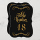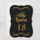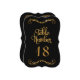 Elegante tipografía de escritura caligráfica en un fondo negro moderno pero atemporal con purpurina dorado con número de mesa de personalizable para una elegante recepción de boda formal u otro evento. El trabajo de desplazamiento superior e inferior se hizo a partir de los adornos de la impresora vintage ornamentada y terminó el diseño. Creado por la artista y diseñadora con licencia internacional, Audrey Jeanne Roberts, copyright.