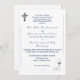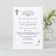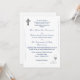 Design front features a pure white background to the elegant image of a silver crucifix at top left corner. Bottom right corner displays the image of the Holy Eucharist suspended above chalice with the image joined wedding rings displayed beside it. Following the traditional format for a Catholic wedding invitation, text is featured in an elegant blue font. The names of bride and groom, along with event are displayed in a graceful Nuptial font. Design is accented by an elegant flourish aligning the left and right sides