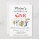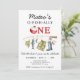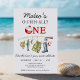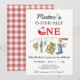 Invitación de primer cumpleaños a un niño Cute con tema de pesca de primer cumpleaños con la palabra "dos" usando un gran barbero de pesca. Esta invitación de cumpleaños también incluye una caña de pescar con botas de pesca, pescado, señuelo, pepino, gorra de pesca y chaqueta de pesca. La parte posterior presenta un diseño de gingham blanco y rojo.