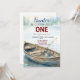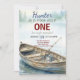 A vintage fishing baby shower invitation featuring a wooden rowboat with a fishing pole floating on a misty morning lake. Perfect for a peaceful outdoor celebration.