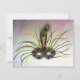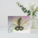 Pintura acuática con toques pastel ligeros de una máscara de pluma mardi gras. La decoración utiliza los colores tradicionales del Mardi Gras: morado, verde y dorado. Dos plumas de pavo real se colocan encima de la máscara. Personalice esta invitación de máscara de Mardi Gras con sus propios detalles de fiesta.