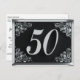 Tarjeta postal decorada con texto plateado y florituras ornamentadas en las esquinas con fondo negro para un cumpleaños 50. Dependiendo del texto que ingrese, se puede utilizar como invitación o tarjeta de felicitación.