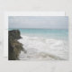 Invitación de partido genérica. Fotografía de naturaleza fresca y pintoresca de un océano azul turquesa brillante con olas de espuma blanca estrellándose contra una roca marrón resquebrajada. Cielos nublados de color azul grisáceo.