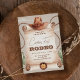Ensilla para un viaje salvaje con nuestra invitación temática occidental, perfecta para tu primer rodeo o fiesta de vaquero. Elaborada en tonos marrones rústicos, establece el tono para un evento lleno de aventuras en la frontera. Atrae a tus invitados con este diseño auténtico, garantizado para traer el espíritu del Salvaje Oeste a cualquier reunión.