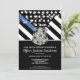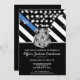 Este diseño presenta una bandera de la fuerza policial con franjas negras y blancas, y una franja de línea azul delgada también. La insignia de la policía y el texto plateado se encuentran encima de todos los detalles de la fiesta para el oficial de cumplimiento de la ley que se jubila, alguacil, capitán o jefe detalles de la fiesta de jubilación.