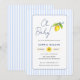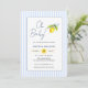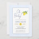 ¡Oh, nena! Modernas y cálidas rayas azules y blancas, adornadas con una invitación a la ducha de bebé con temática mediterránea Lemons. Perfecto para divertirse con la alegre ducha de bebé.