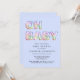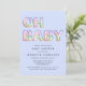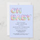 Esta tierna invitación a bañarse de niños pequeños, minimalista, azul y azul, incluye "OH BABY" compuesto de ilustraciones de globo en un arcoiris de pasta, azul, verde, rosa, púrpura y naranja.