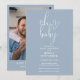 Esta invitación para baby shower de elegante letra script dusty blue puede ser personalizada con toda la información de su celebración especial y una foto especial en el reverso. Diseñada por Thisisnotme©