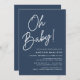 Sencillas invitaciones para una ducha de bebé con "Oh bebé" mostradas en un audaz guión blanco con fondo marino. Personalice las invitaciones minimalistas a la ducha con el nombre de la madre y los detalles de la ducha. Las invitaciones a la ducha de bebé de la marina se invitan a revertir para mostrar un fondo sólido que coincide con el espacio para texto adicional. ¡Las invitaciones son perfectas para las duchas de bebé sin distinción de género!