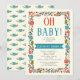 Oh Bebé ducha roja y verde azulada invitación floral azul que muestra la frase "Oh bebé" en rojo y verde azulado, un ilustracion de un borde floral hecho de hermosas flores silvestres con hojas de olivo verde en el fondo de marfil. Texto en blanco y negro sobre un cartel verde azulado.
