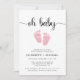 Una pequeña invitación a la ducha de bebé de una pareja simple con "oh baby" en un guión elegante con toques y una acuarela rosa pastel de pies de bebé. Debajo se pueden personalizar fácilmente los detalles de la ducha.
