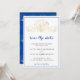 Este elegante diseño costero presenta una concha marina dorada con estilo y olas con un borde azul. Se invierte a un patrón de conchas doradas sobre fondo azul. Perfecto para bodas con tema de playa, verano o náutico. Diseño © Rosalind Moore, Cherry Lane Designs.