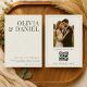 Celebrate your special day with this elegant olive green botanical wedding invitation. A warm olive-toned backdrop sets the stage for a soft, understated leaf illustration and refined serif typography. The back features a full photo section and a convenient QR code that links to your itinerary, RSVP page, or wedding website. Stylish, modern, and nature-inspired, this design is perfect for couples seeking an elevated earthy aesthetic. Fully customizable.