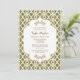 Elegante y bello estilo francés inspirado en la ducha de novias marroquí con un repetido diseño geométrico de color verde oliva y oro y florecientes flores de tonos dorados. Esta invitación de lujo y lujo es perfecta para cualquier tipo de ducha matrimonial, exótica, marroquí, árabe o con temática aladina. La parte posterior de estas invitaciones y invitaciones de cuadros lujosos y personalizados se pueden personalizar con el nombre de evento y monograma de la novia en forma de quatrefoil y el diseño impreso de la cinta. Obra de arte y diseño © Chrissy H. Estudios, LLC.Todos Los Derechos Reservados.