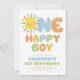 One Happy Boy! A bright and colorful sun themed boys 1st birthday invitation in blue, orange, yellow and green. Available in other colors.