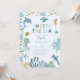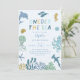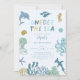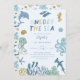 Carta de invitación a la fiesta de primer cumpleaños de un chico lindo con ilustracion de criaturas marinas y arrecifes de coral. El texto dice "mira al mar".
