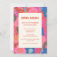 Celebrate your new home with this vibrant open house invitation featuring a bold tropical floral border in pink, orange, and blue. The modern botanical design with abstract leaves and flowers creates a fun, welcoming atmosphere for your celebration. Fully customizable with your party details, address, and time. Perfect for casual drop-in style housewarming events.
