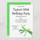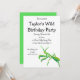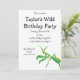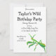 Esta invitación presenta un ilustracion pintado de una mantis rezadora en verde brillante con acentos naranjas y está lista para ser personalizada con todos los detalles de su fiesta.