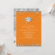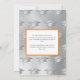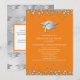 This modern design features a graduation hat and confetti in silver on a background of Orange with white text.