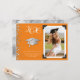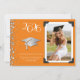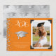 This modern design features a graduation hat and confetti in silver on a background of Orange with white text.