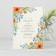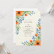 This artistic design features vibrant watercolor poppies in tangerine orange and clusters of azure blue forget-me-nots. Delicate green foliage and airy stems create a whimsical, natural feel against a soft cream backdrop. Perfect for a breezy spring or summer event, the botanical elements evoke a joyful and romantic meadow aesthetic.