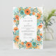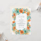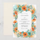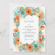 This design features vibrant and artistic watercolor floral clusters that evoke a refreshing summer atmosphere. A bold palette of bright orange and cool turquoise creates a striking contrast against the clean white backdrop. Lush ranunculus and delicate anemones are nestled among soft green eucalyptus foliage. The painterly style offers a joyful and breezy aesthetic.