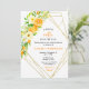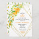This fun and whimsical baby shower invitation features watercolor oranges, daisies and foliage on a gold geometric frame. The text combines handwritten script and serif fonts for a stylish and modern look. This is perfect for a summer rustic baby shower.