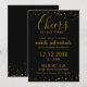 Invitación de aniversario dorado con confeti dorado y tipografía de felicitaciones por 50 años en un fondo negro. Personalice las invitaciones negras y doradas con detalles.