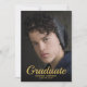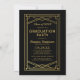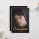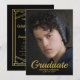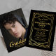 Invitaciones de graduación con temática de gran Gatsby que presentan una foto con sangrado completo del graduado en la parte frontal. En el reverso hay un fondo negro clásico con un borde vintage de lámina dorada con glamour y una plantilla de fiesta de graduación con tipografía elegante.