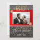 Invitación negra y dorada con seda roja que presenta la fotografía de la pareja. La imagen está decorada en la parte superior izquierda e inferior derecha con un broche de diamantes dorados y rosados.