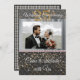 La invitación negra y dorada con seda plateada presenta la fotografía de la pareja.