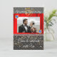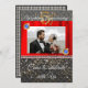 La invitación Chic Black y Gold con seda roja presenta la fotografía de la pareja. La imagen está decorada en la parte superior izquierda e inferior derecha con un broche de Diamantes Zafiro dorado y azul.