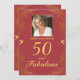 Celebra cumpleaños como un Fabuloso 50 con este rico diseño rojo y dorado que incluye una hermosa foto, elegantes detalles de hoja, delicados acentos de colibrí y texto de personalizable. Perfecto para invitaciones, tarjetas de felicitación, envoltura de regalo, así como para fiestas de cumpleaños como banners y placas de papel. Este diseño le dará un toque cálido y elegante a su celebración especial. Para consultas de soporte o personalización, póngase en contacto con remidevandesigns@gmail.com. RemideVan©