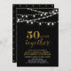 ¡Celebra tu día especial con esta elegante invitación a la fiesta de aniversario de 50 años! Este diseño presenta una tipografía de escritura dorada elegante y luces de cuerda en un fondo negro. Artículos coincidentes disponibles en mi tienda BaraBomDesign.