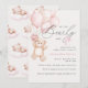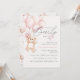 Cute y adorable osito de peluche de acuarela sosteniendo globos rosados en tipografía moderna y manuscrita para invitación de ducha de bebé para niña,