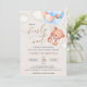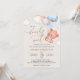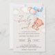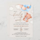 Invite a sus amigos y familiares con estilo y establezca el tono de su día especial con esta encantadora invitación a la ducha de bebé. El diseño presenta un oso bebé con globos azules sobre fondo beige.