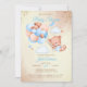 Oso de peluche con globos marrones y azules y nubes invitaciones para la ducha de bebé.