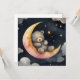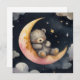 Una encantadora pieza de acuarela que muestra a un oso dormilón acurrucado en una luna creciente brillante, rodeado de nubes suaves y estrellas. Este diseño conmovedor es perfecto para el arte mural de guardería, decoración temática para la hora de dormir o como regalo para jóvenes soñadores. Traiga la magia del cielo nocturno a su hogar con esta obra de arte relajante.